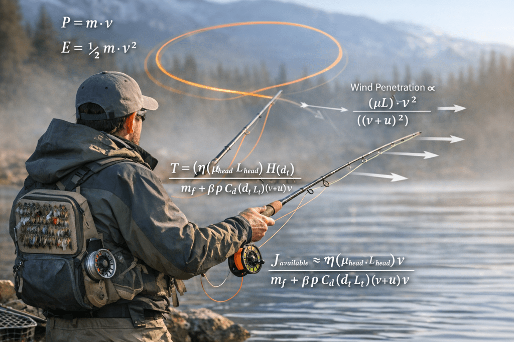 When you cast into the wind, the cast fails for one of two reasons: wind drag, or timing failed to maintain tension and loop shape at the speed required. So “cutting power” is basically: how much momentum/energy the loop carries forward per amount of drag it experiences. The two physics ingredients: drive, or the kinetic energy of the moving line, and resist, the aerodynamic drag from the wind.