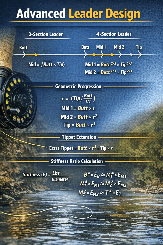 Calculating a leader mathematically before tying it is one way to guarantee the leader will perform critically. In my article Advanced Leader Design (https://madanglerhub.com/2026/01/30/advanced-leader-design/) I explain how to calculate the mid-section for a three section leader. If you know your tippet and butt then you can calculated the mid section and have a smooth transfer of energy based on a mid line between the butt and the tippet, as seen here: