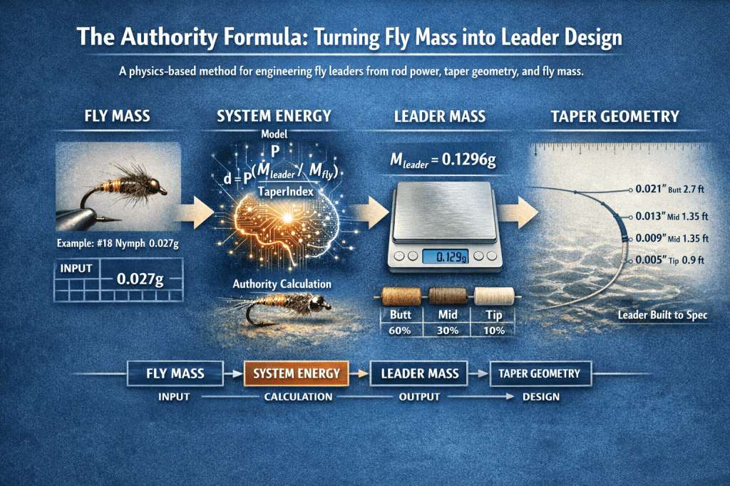I come from a software engineering background and I have designed a lot of this to be like a software pipeline. Most anglers think: fly size → tippet size → guess leader. I am doing: fly mass → system energy → leader mass → taper geometry. The mechanics and functions presented here allow us to govern our leader system rather than playing the guessing game.
